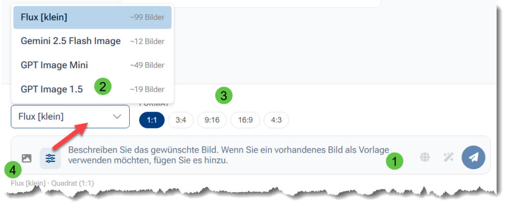 (2) Legen Sie fest, welches KI-Modell (Fachwort: LLM) Sie verwenden möchten. Die angegebene Zahl der verfügbaren Bilder gibt an, wie viele Bilder pro Monat noch erzeugt werden können.