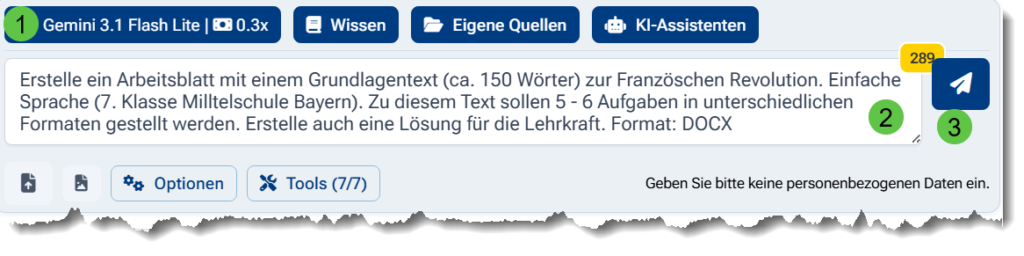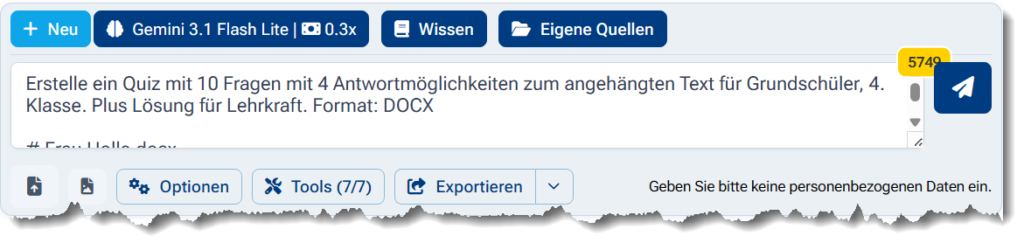 Sie haben ein monatliches Kontingent (= 100%). Je nach gewähltem KI-Modell und Umfang der Aufgabe verringert sich dieses Guthaben. - Beachtung der DSGVO: keine personenbezogenen Merkmale wie z. B. Schülernamen, Fotos mit Schülern, Handschriften von Schülern usw. verwenden